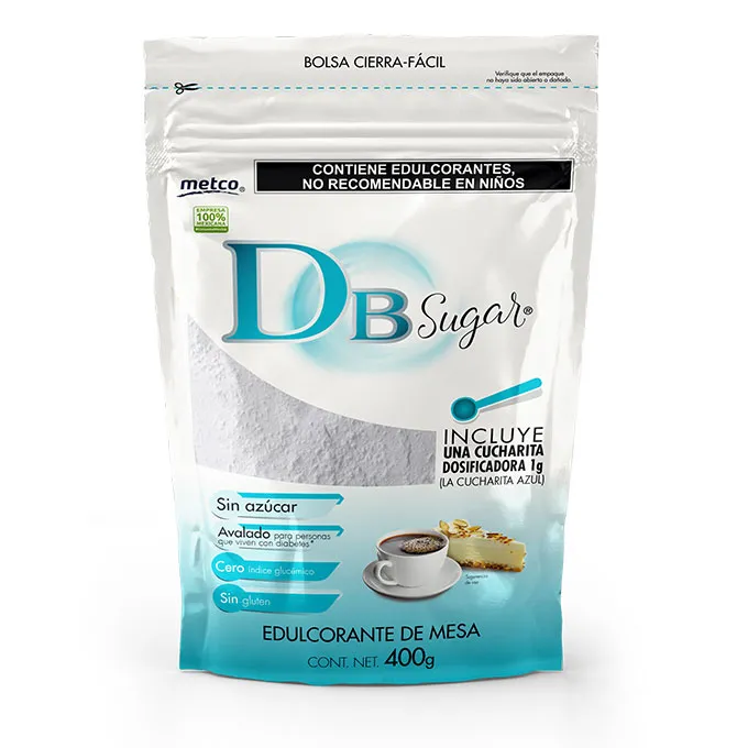 DB Sugar® es un sustituto de azúcar sin calorías, no contiene carbohidratos metabolizables y no eleva el azúcar en la sangre (glucosa). Hecho a base de Isomalt, Inulina y Sucralosa.